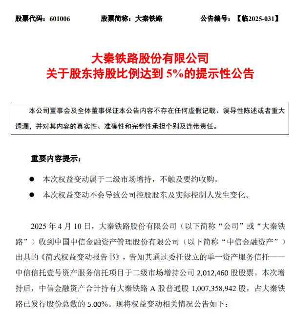 据公告披露,本次权益变动前,中信金融资产持有大秦铁路10.05亿股,占上市公司总股本的4.99%(截至2025年2月10日的总股本为201.47亿股)。