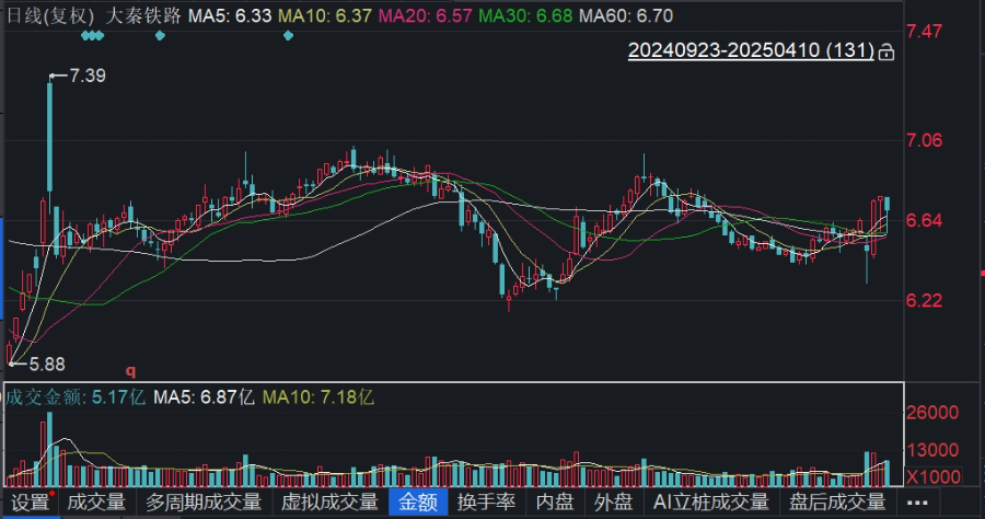 截至4月10日,大秦铁路报6.68元/股,总市值为1346亿元。