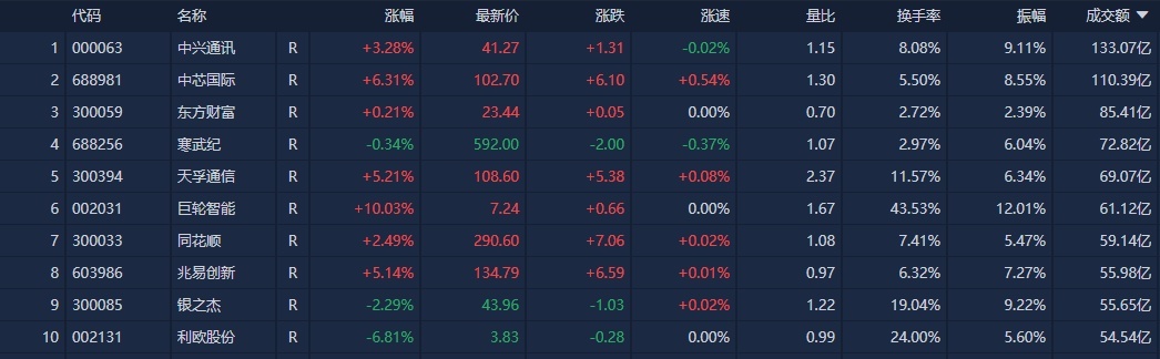 个股方面,中兴通讯成交额居首,为133.07亿元。其次是中芯国际、东方财富、寒武纪、天孚通信,成交额分别为110.39亿元、85.41亿元、72.82亿元、69.07亿元。